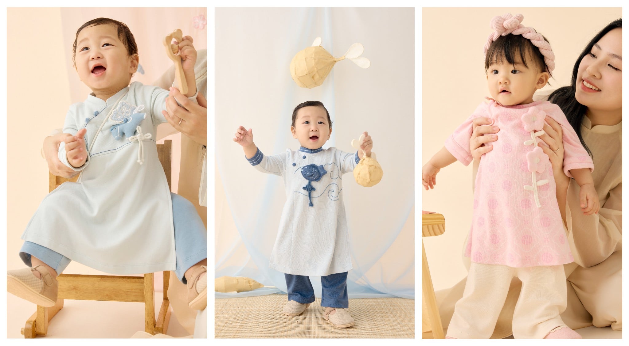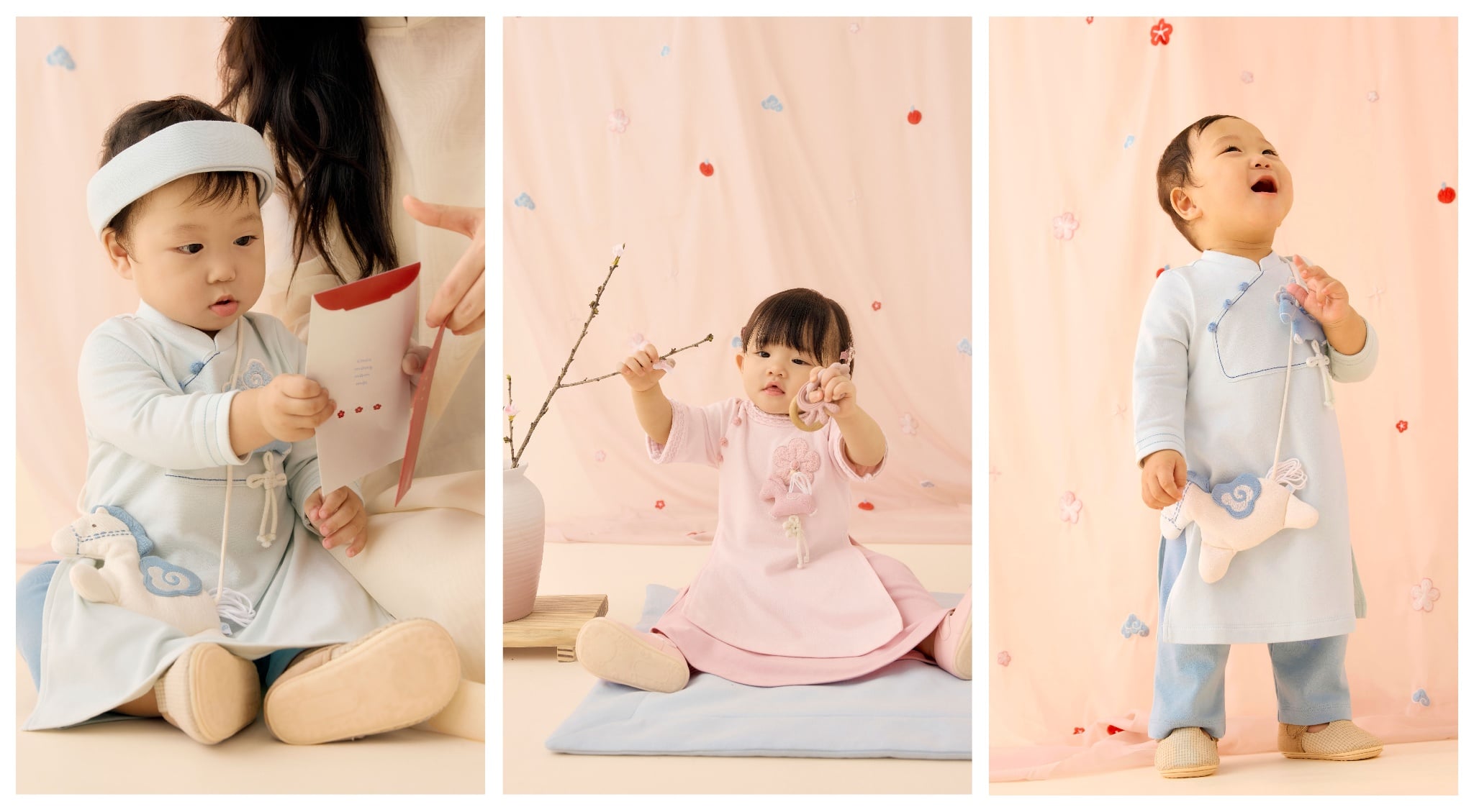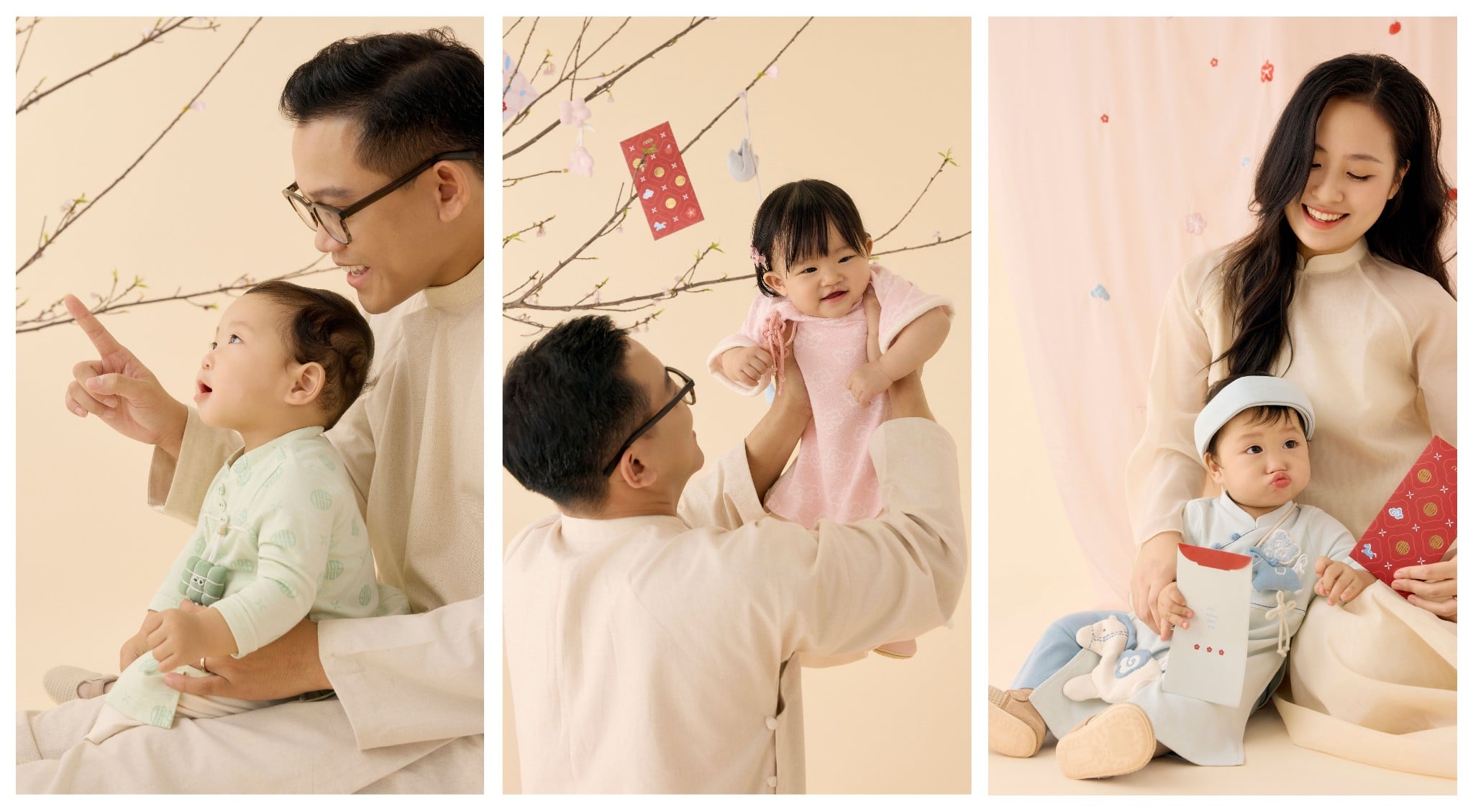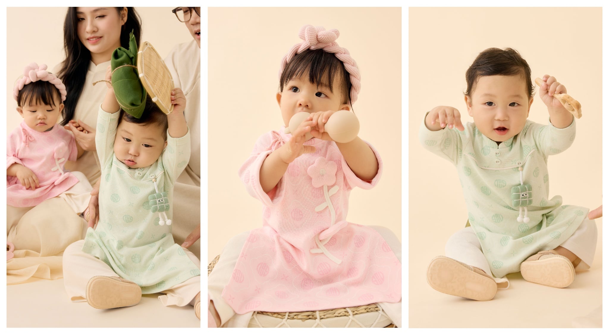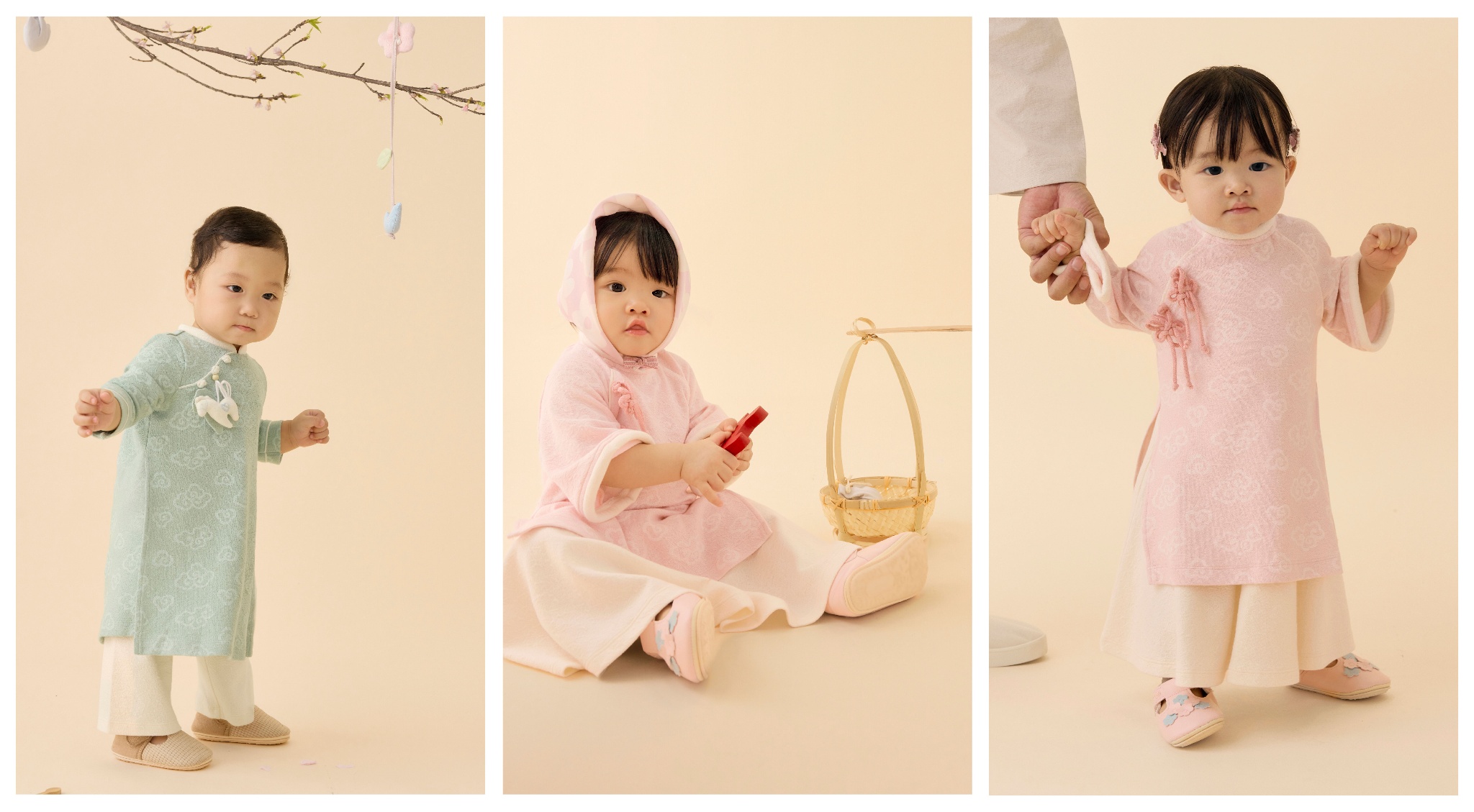 Lấy cảm hứng từ họa tiết trong tranh dân gian Việt Nam và thiết kế của tà áo dài truyền thống, những chi tiết dây tết, charm nhồi bông thủ công như những dấu mốc bé xíu, lưu lại hành trình em bé chạm vào mùa Tết đầu đời: Chạm vào mâm cỗ Tết, vào cành đào rung rinh, hay bao lì xì đỏ thắm, tất cả đều được chở che trong vòng tay yêu thương của gia đình.
