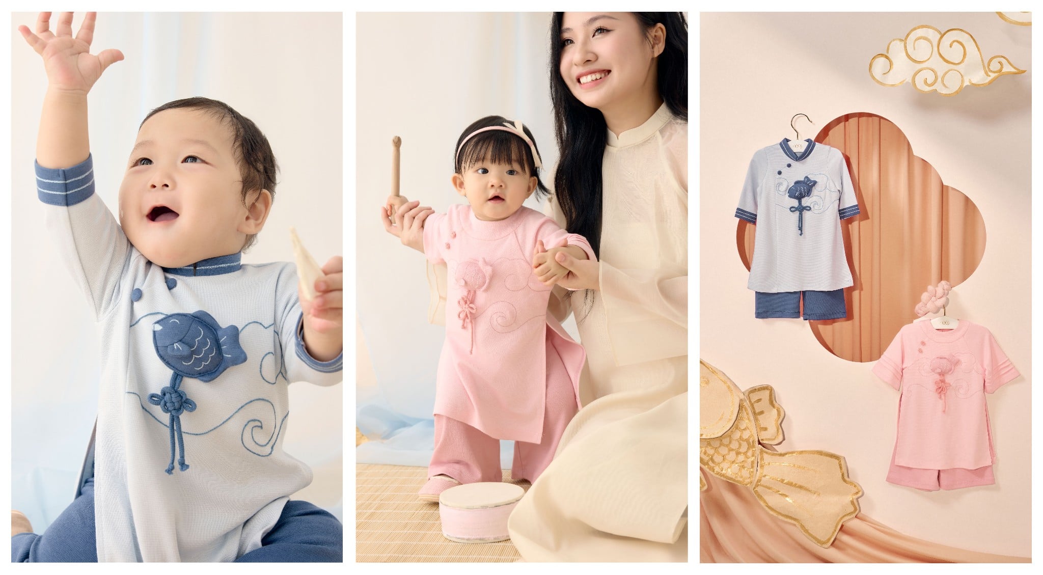 Tết bắt đầu từ câu chuyện dân gian ba mẹ hay kể, rằng cuối năm, cá chép sẽ theo ông Táo về trời, mang theo ước nguyện về một khởi đầu an lành trong năm mới. Cá chép về trời, mời xuân tới bằng những gam màu pastel dịu nhẹ. Họa tiết mây vờn sóng lượn được lấy cảm hứng từ tranh Hàng Trống, cùng charm cá nhồi bông như lời chúc bé hay ăn chóng lớn và thật mạnh khỏe.
