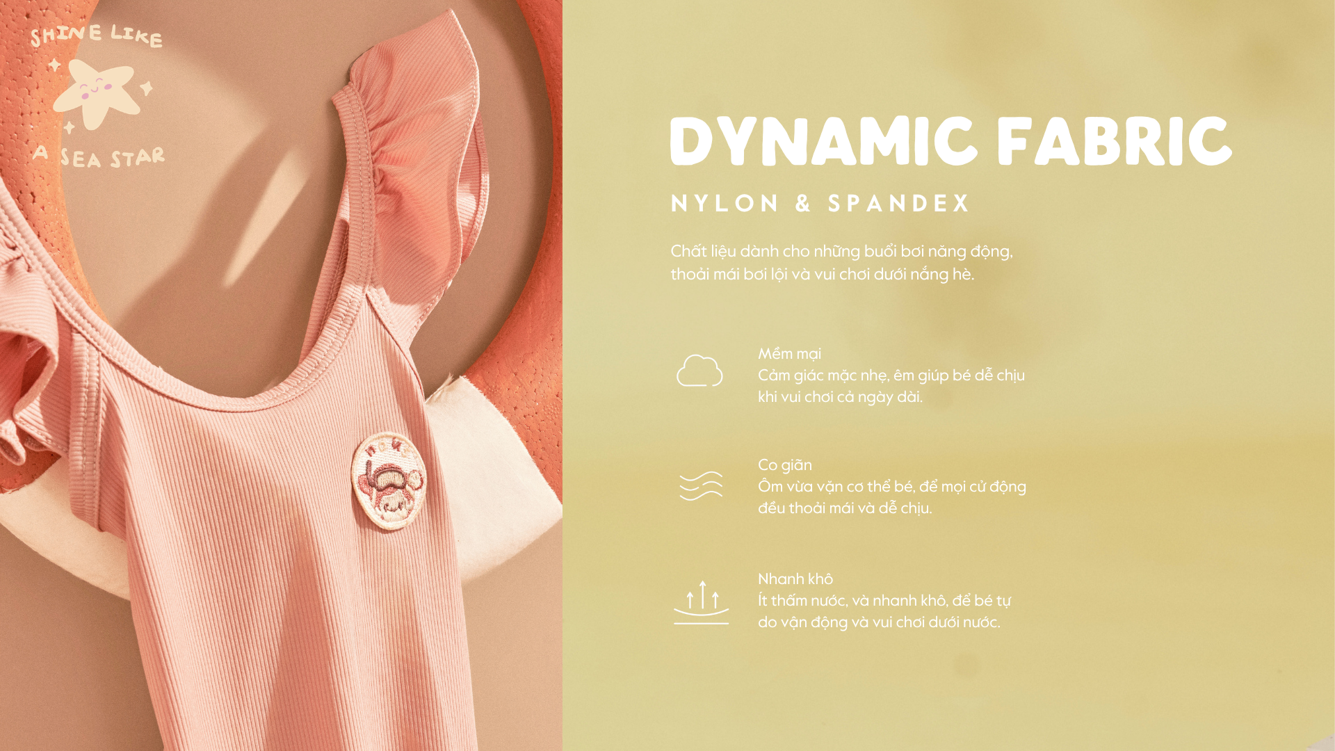 Chất liệu được Nous lựa chọn kỹ lưỡng để đồng hành cùng bé trong suốt những giờ vui chơi không ngừng nghỉ. Sự kết hợp giữa nylon và spandex mang đến độ co giãn linh hoạt, giúp bé vận động thoải mái mà không bị gò bó. Bề mặt vải mềm mại, nhẹ và nhanh khô, hạn chế giữ nước, tạo cảm giác dễ chịu cả khi ở dưới nước lẫn khi trên bờ.