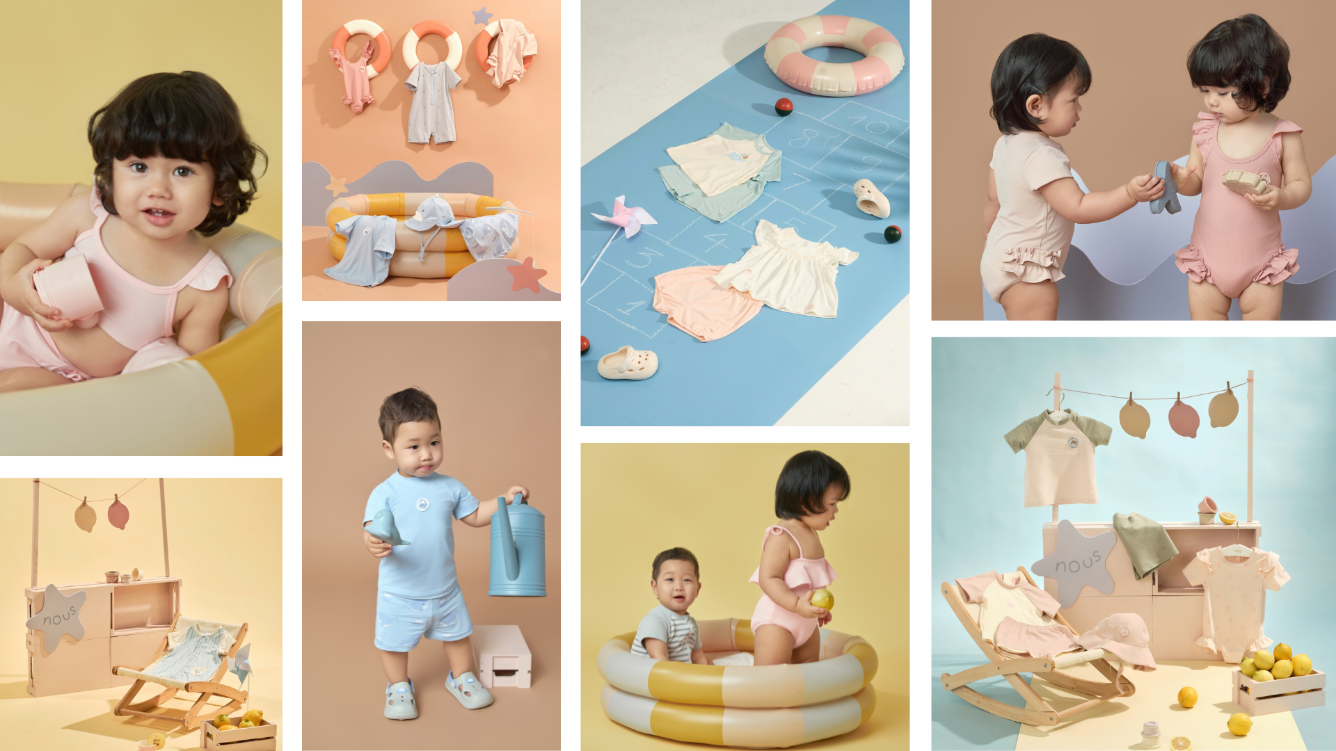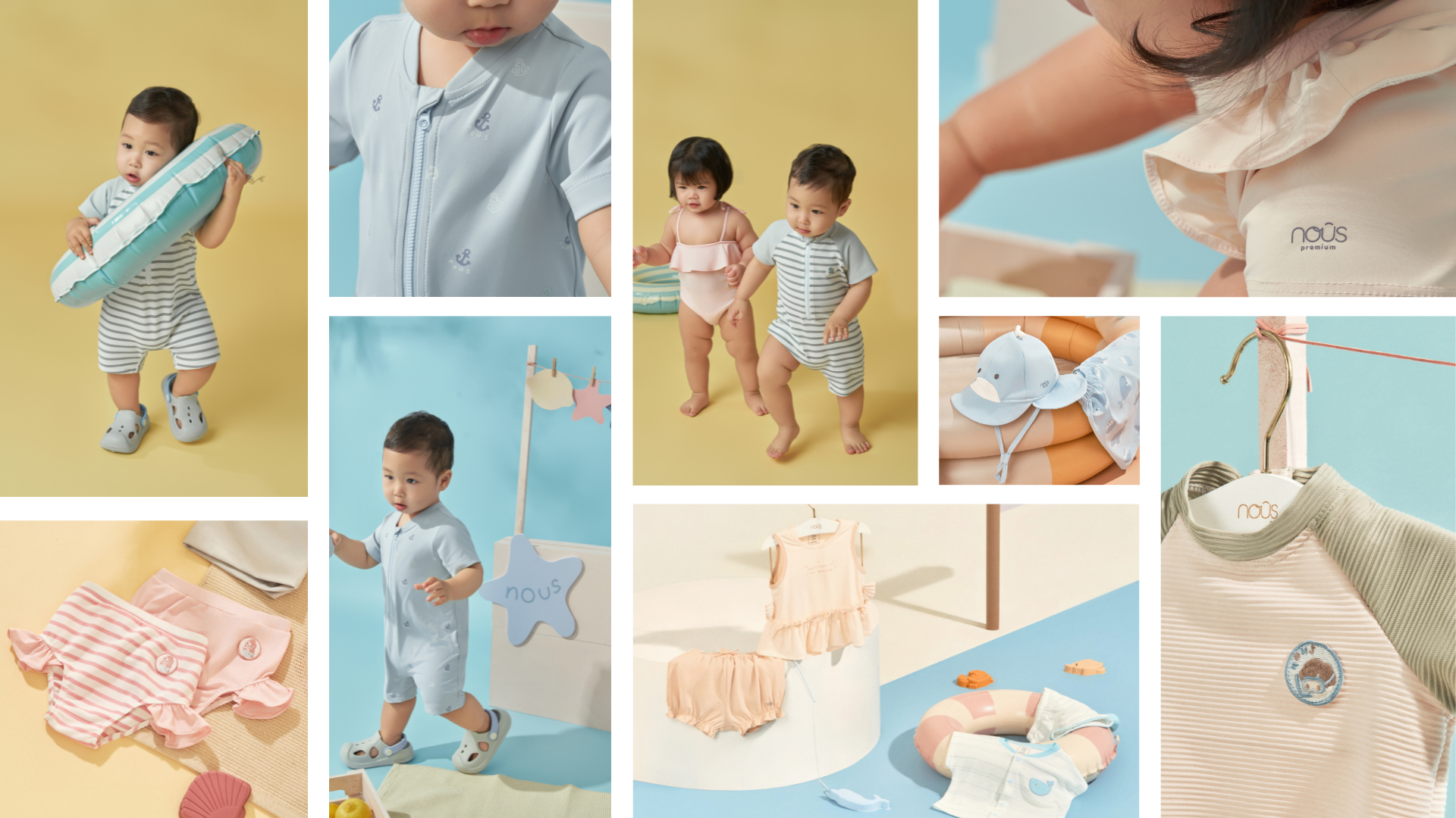Bảng màu của bộ sưu tập Nous Swim gợi mở một mùa hè rực rỡ với những sắc thái quen thuộc của mùa hè: sắc xanh mát của làn nước biển, là sắc vàng của nắng, là sắc hồng của những viên kẹo ngọt… Từng gam màu được Nous lựa chọn và kết hợp hài hòa, tạo tổng thể tươi sáng nhưng vẫn dịu mắt, để mỗi khoảnh khắc của bé bên bờ biển thêm phần nổi bật mà vẫn rất nhẹ nhàng, dễ thương.